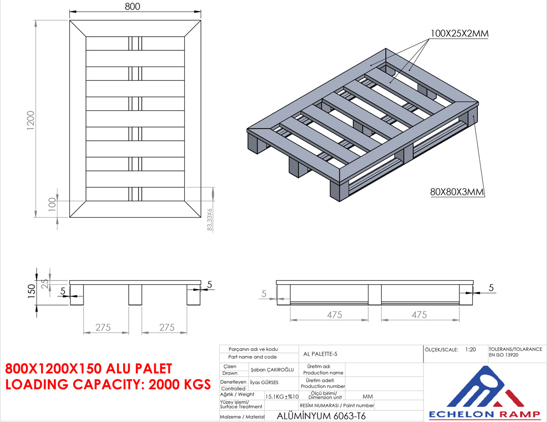 Das Modell AL PALETTE-51:20 ist vollständig mit Gabelstaplern und automatisierten Transportsystemen kompatibel. Die technische Zeichnung wurde von Şaban Çakıroğlu und İlyas Gürses erstellt. Dank ihrer recycelbaren Struktur ist sie auch eine umweltfreundliche Wahl.